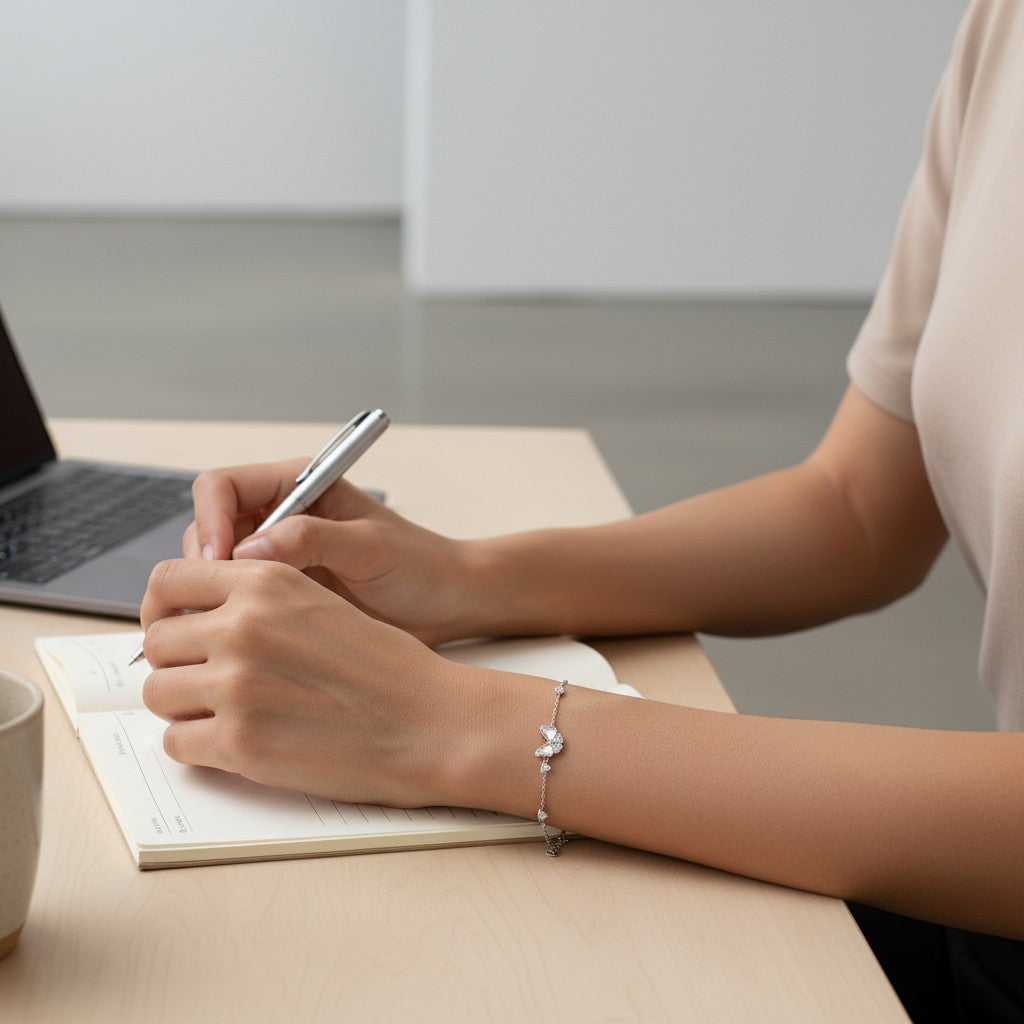A delicate symbol of transformation β the Siora Butterfly Bracelet is designed in 925 sterling silver with a refined rhodium finish, featuring finely detailed butterfly motifs illuminated with AAA+ zircon sparkle.
