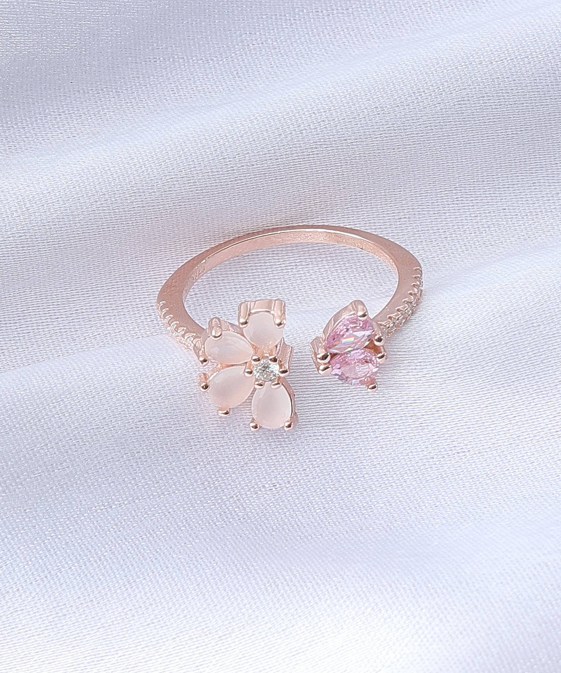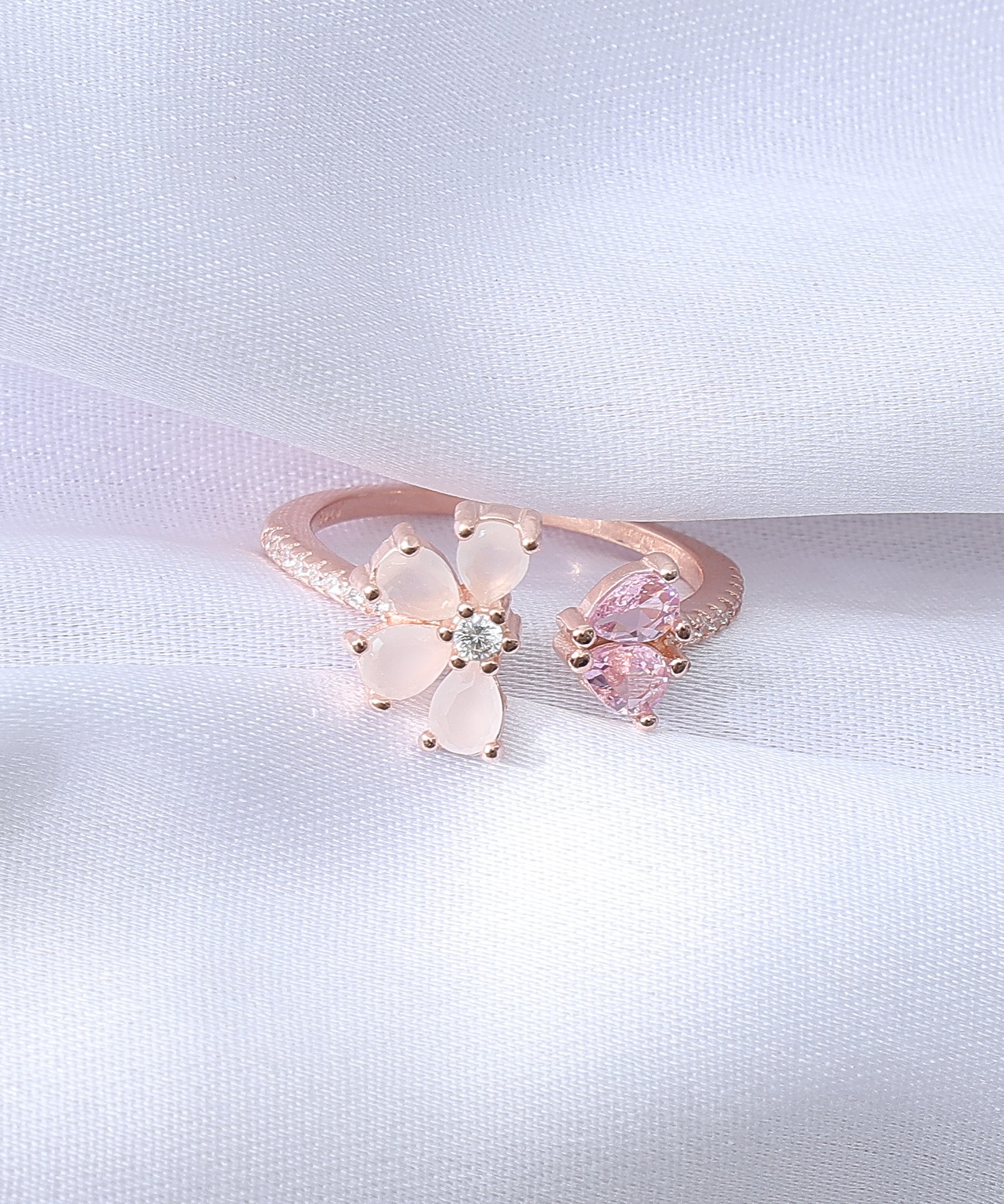 Whimsical wings with a playful glow — Siora’s Flutter Duo Ring in rhodium finish blends soft pink enamel with sparkling zircons for a feminine touch of everyday luxury.