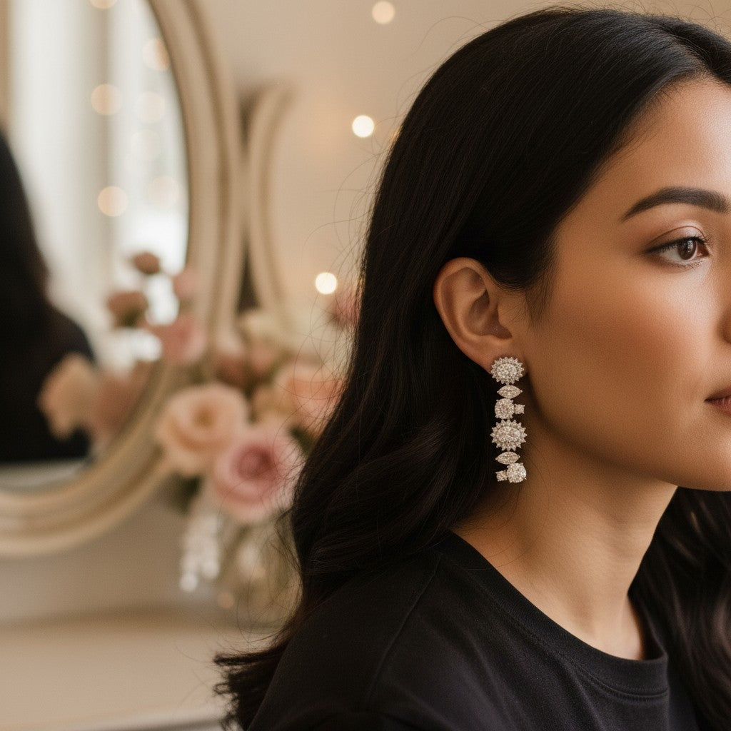 "Radiate timeless brilliance with the Siora Jewels Celeste Cluster CZ Earrings, a perfect fusion of glamour and craftsmanship.