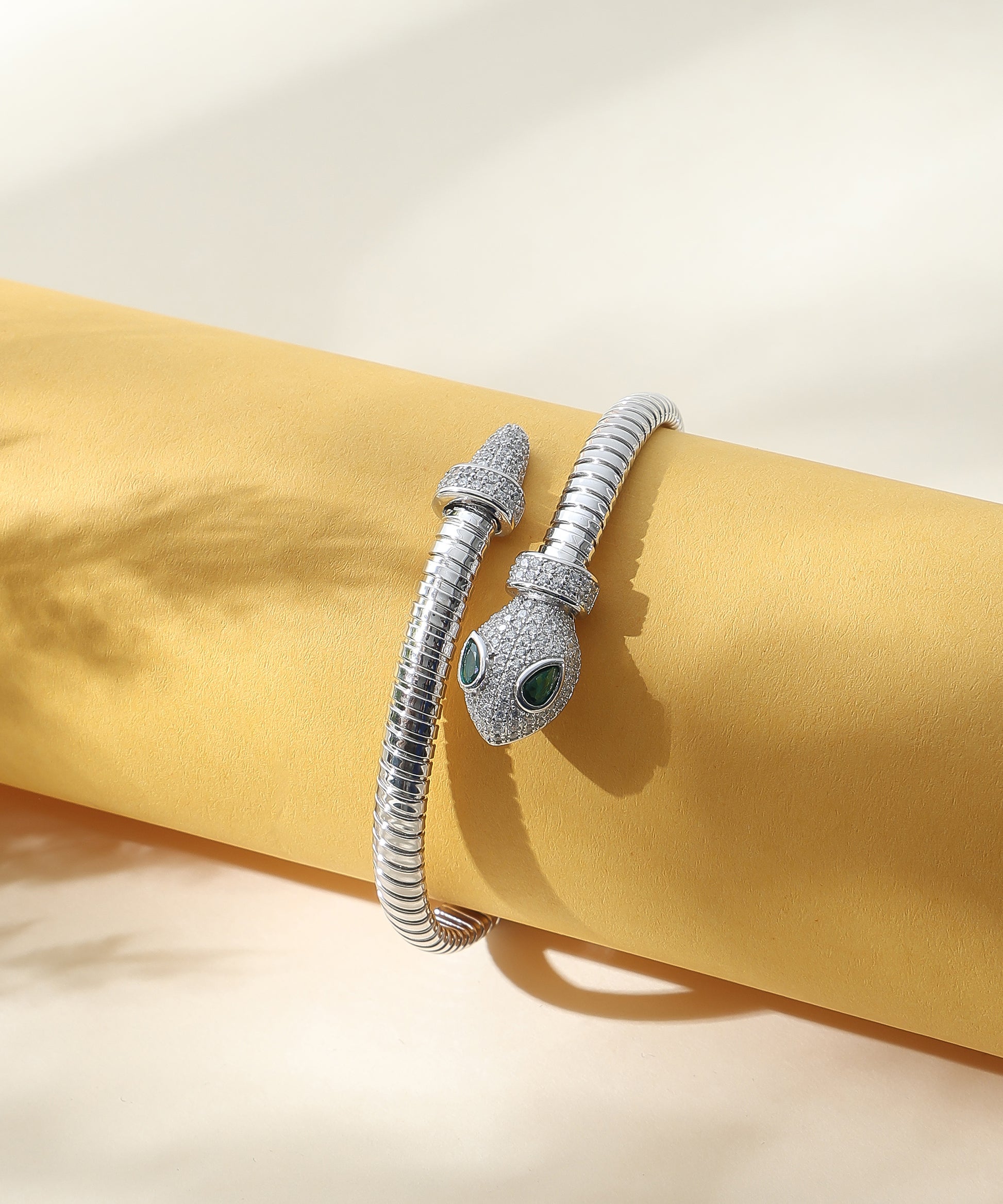 Inspired by the elegance of the serpent, this kada features a sleek, flexible silhouette adorned with pavΓ©-set cubic zircons and emerald-green eyes, representing power, intuition, and modern femininity.